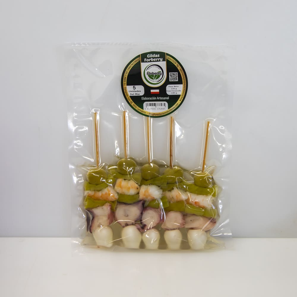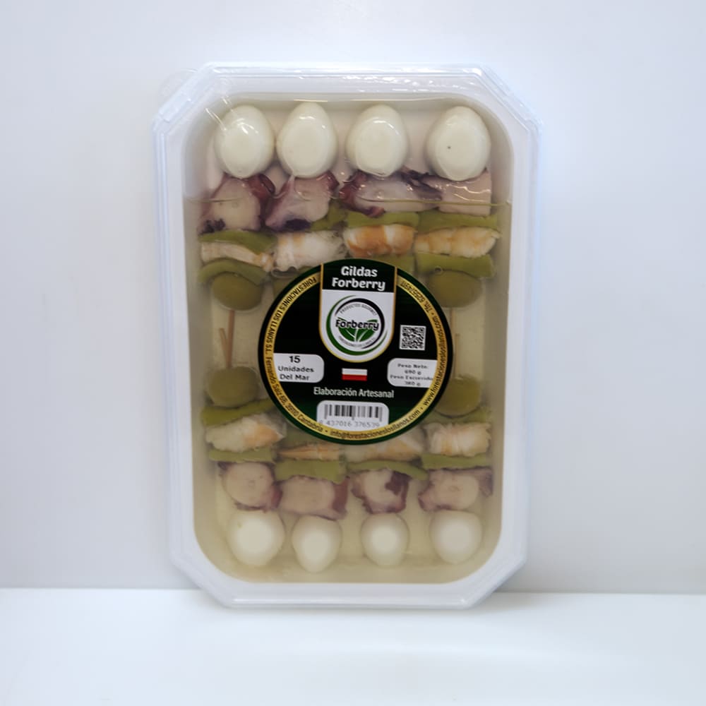 Las gildas del mar de Forberry son la variedad más exclusiva de toda la gama: una combinación de pulpo cocido, langostino, huevo de codorniz, guindilla y aceituna verde en aceite de girasol que convierte este aperitivo en algo difícilmente comparable con cualquier otra gilda del mercado. No es una evolución de la gilda clásica, es una propuesta propia con identidad gastronómica muy marcada.