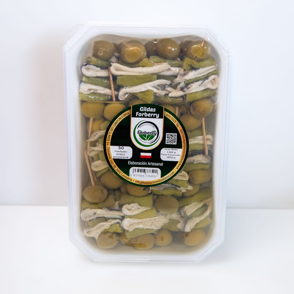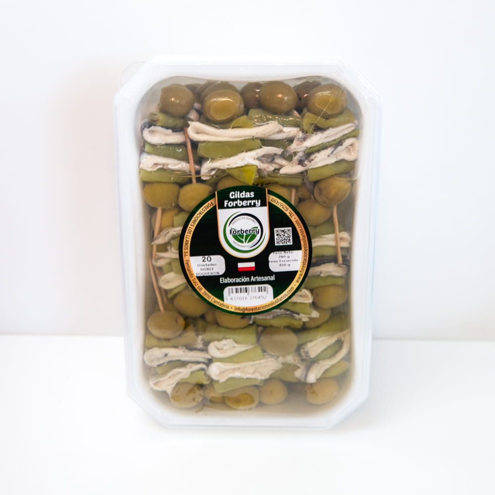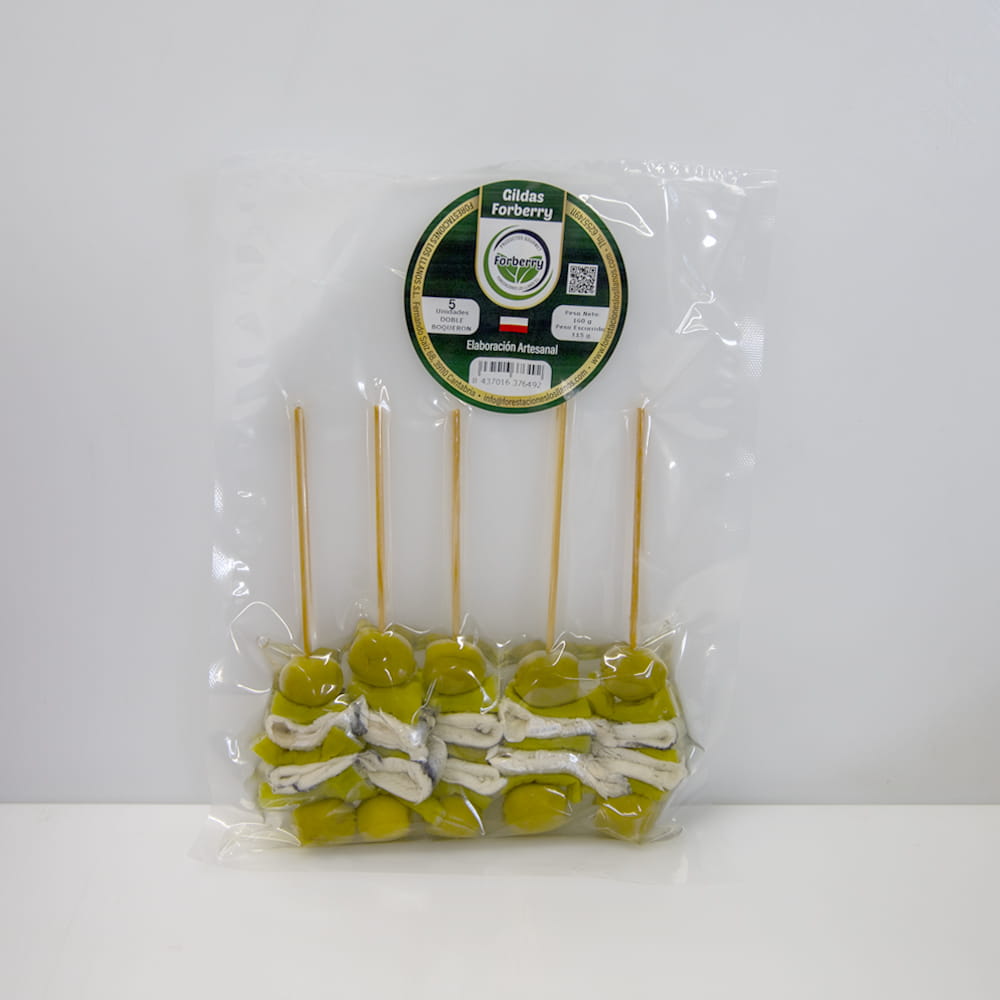 Las gildas de doble boquerón de Forberry son la versión más intensa de la gilda clásica de boquerón: dos boquerones en vinagre, dos guindillas y dos aceitunas verdes en aceite de girasol, en un palillo que multiplica el carácter fresco y ácido de este aperitivo y lo convierte en una referencia para los paladares más exigentes. Una composición limpia, sin artificios, donde el boquerón es el protagonista absoluto.